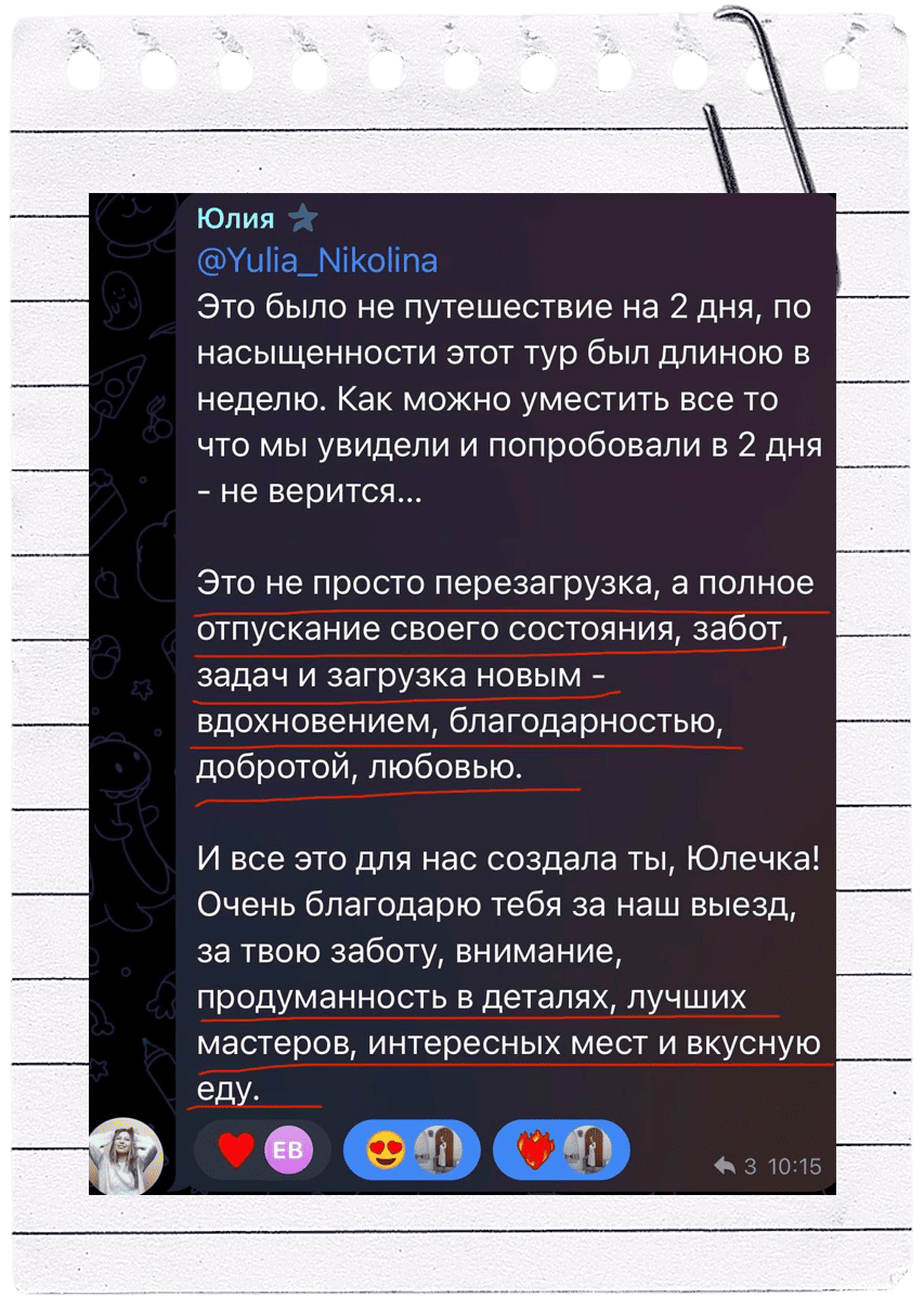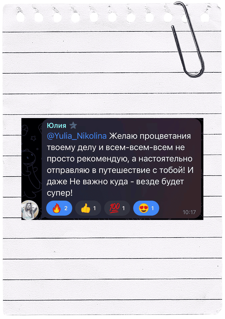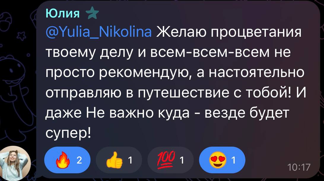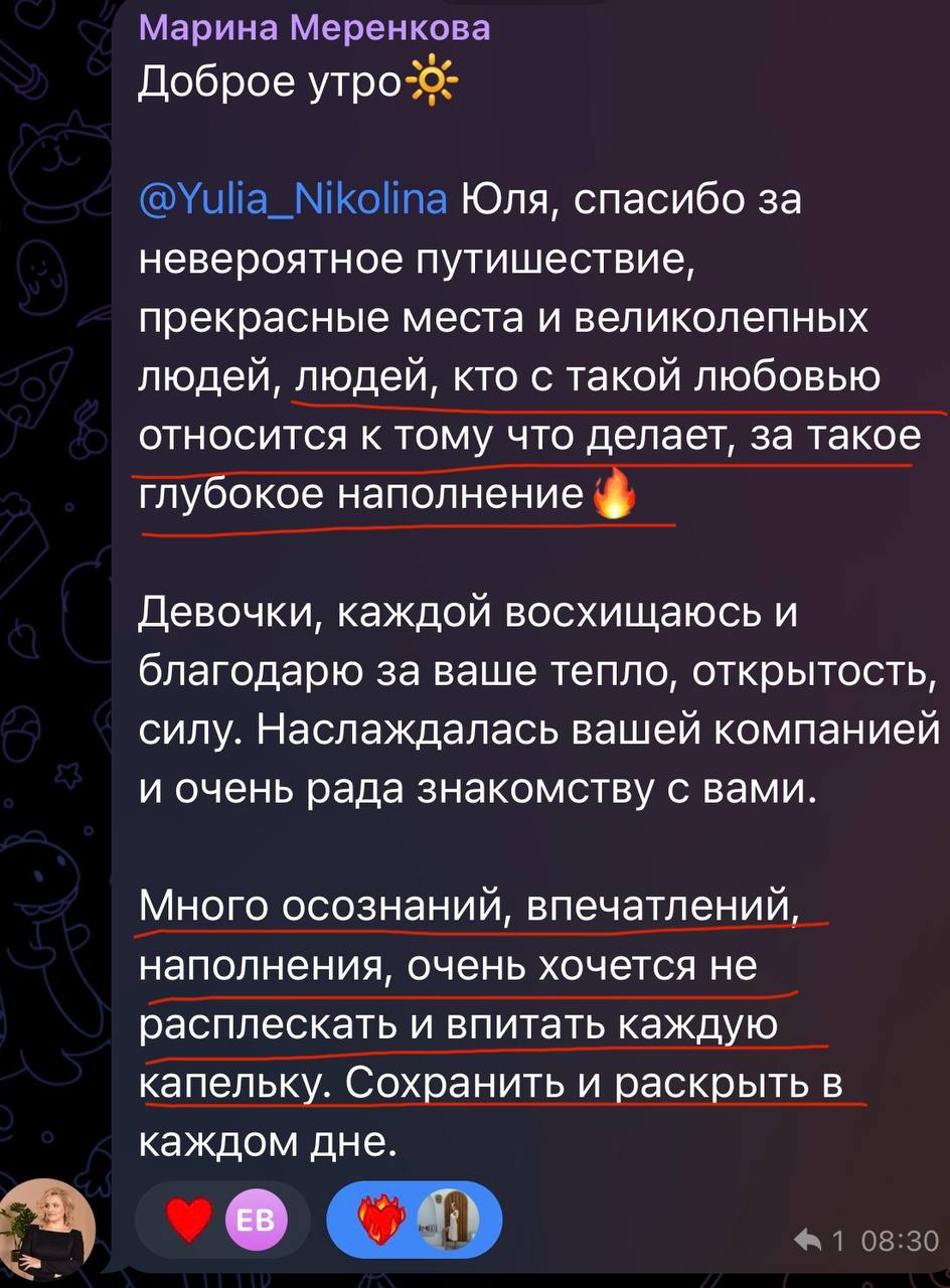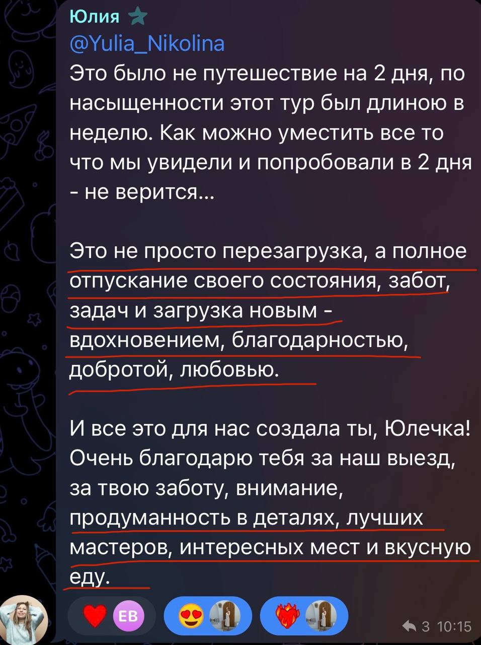 Помочь выдохнуть и вернуть вкус к жизни — без чемоданов, виз и марафонов самопознания. Моя сила — в организации и в людях, которые горят своим делом.